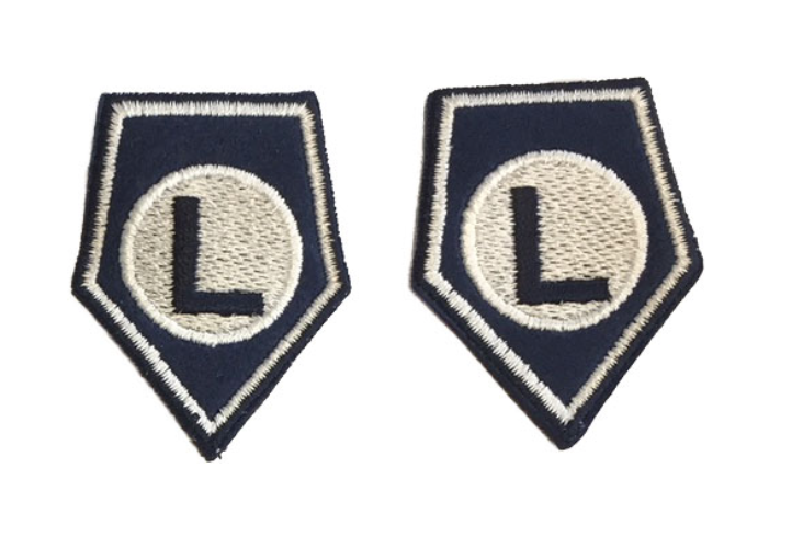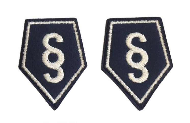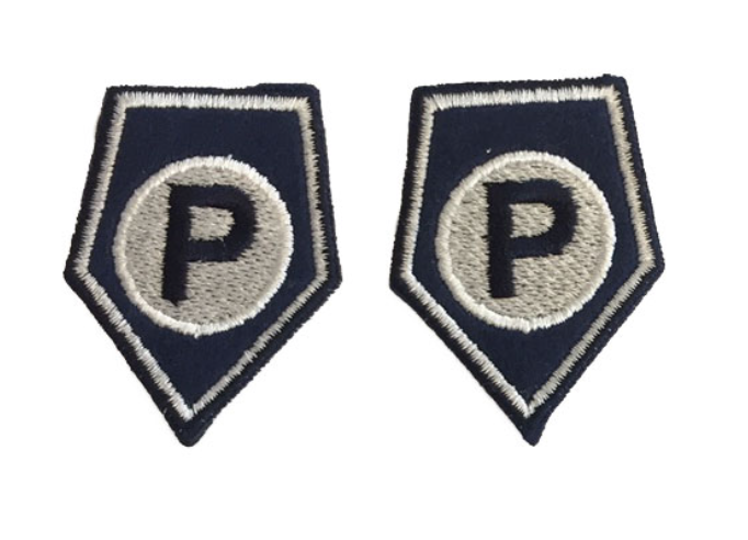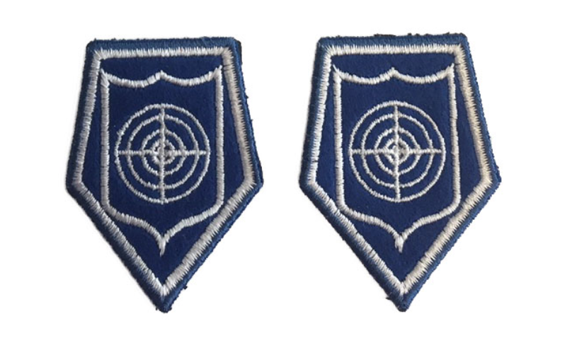 Znaki rodzaju Służby Policji (korpusówki) na kurtkę wyjściową haftowane metalizowaną nitką koloru srebrnego na granatowej tkaninie – nowy wzór –