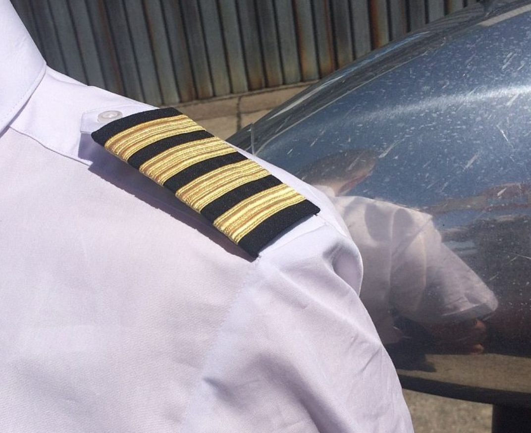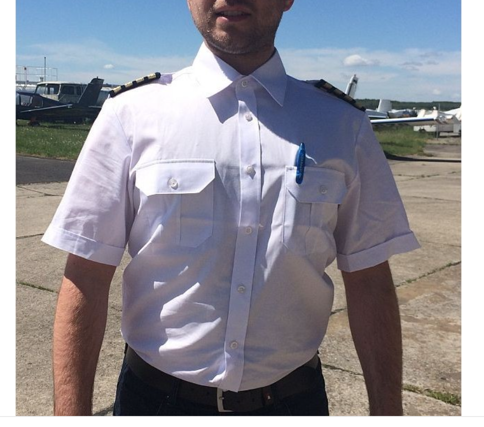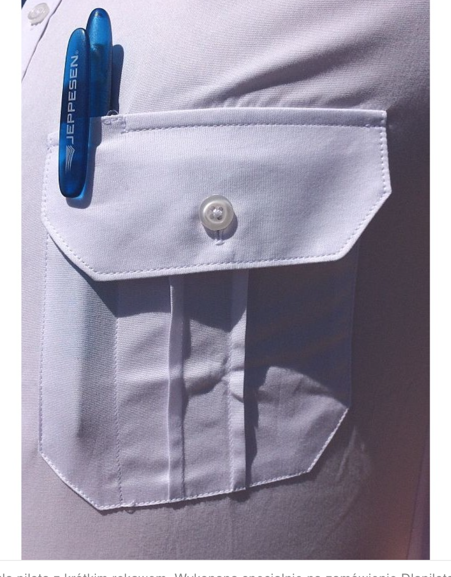 Koszula służbowa dla Pilota – fason Classic, kolor biały, naramienniki na pagony, 2 kieszenie z patkami zapinanymi na guziki, na lewej patce miejsce na długopis.